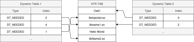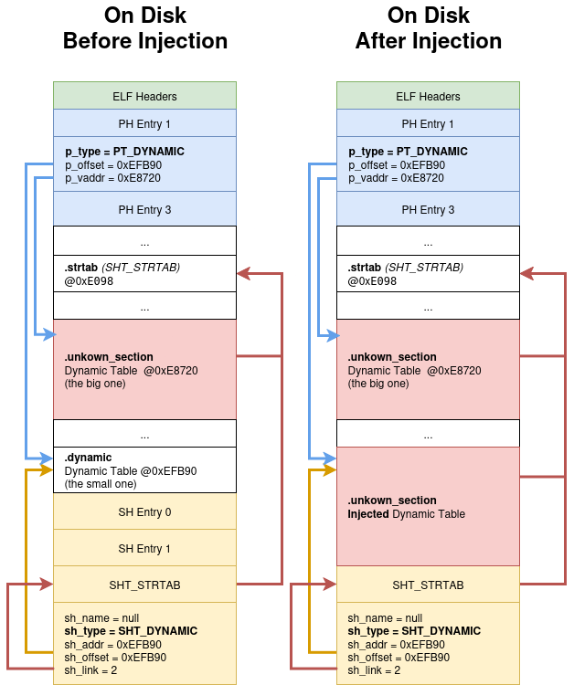 Here are two diagrams explaining the dynamic tables before and after injecting with LIEF. The first table is parsesd by LIEF, the second by Ghidra.